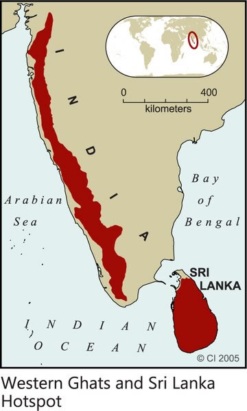 A vital hotspot: the Western Ghats in India, marked in red, and the span of much of Sri Lanka, also in red, identifies the span of this biodiversity hotspot. The breakup of Gondwanaland is one of the factors that shaped the geological history of the region (map courtesy Conservation International), whose southwestern forests are seen in this image (2). Photo: Soham Kacker.